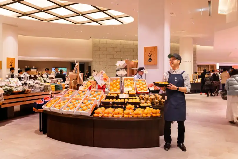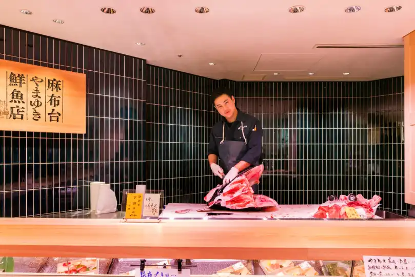 The Azabudai Hills Market – part of Mori Building’s giant new development – covers 4,000 sq m and 34 speciality shops. “We have had lots of experience with restaurant tenants but we had never done food retail,” says Masanori Tsukamoto, who developed the market with his colleague Takashi Ohgaki. “When we thought about how to do really good food retail, it was all about high-quality products,” says Tsukamoto. “We realised that great restaurants had access to the best produce so we talked to the ones we worked with about where they were getting their produce from. Sushi restaurant Saito told us that it was getting its fish from [seafood wholesaler] Yamayuki. We felt that it would be innovative if businesses that were only doing B2B became available B2C.”