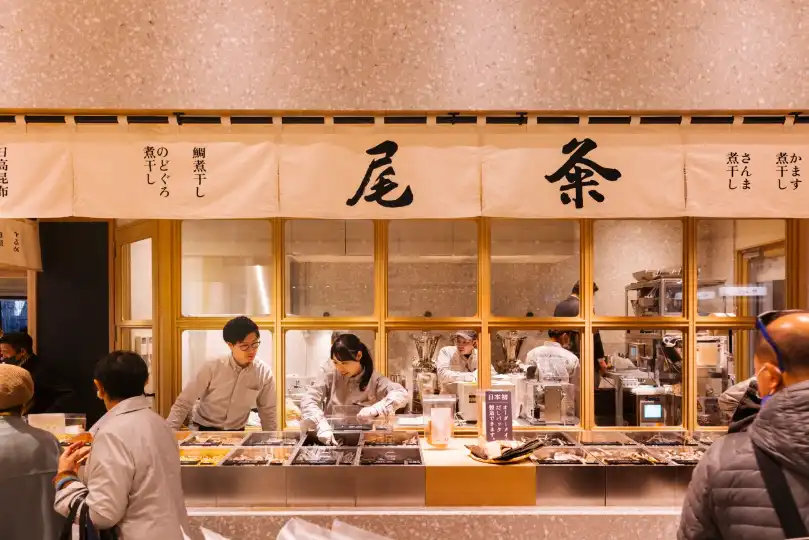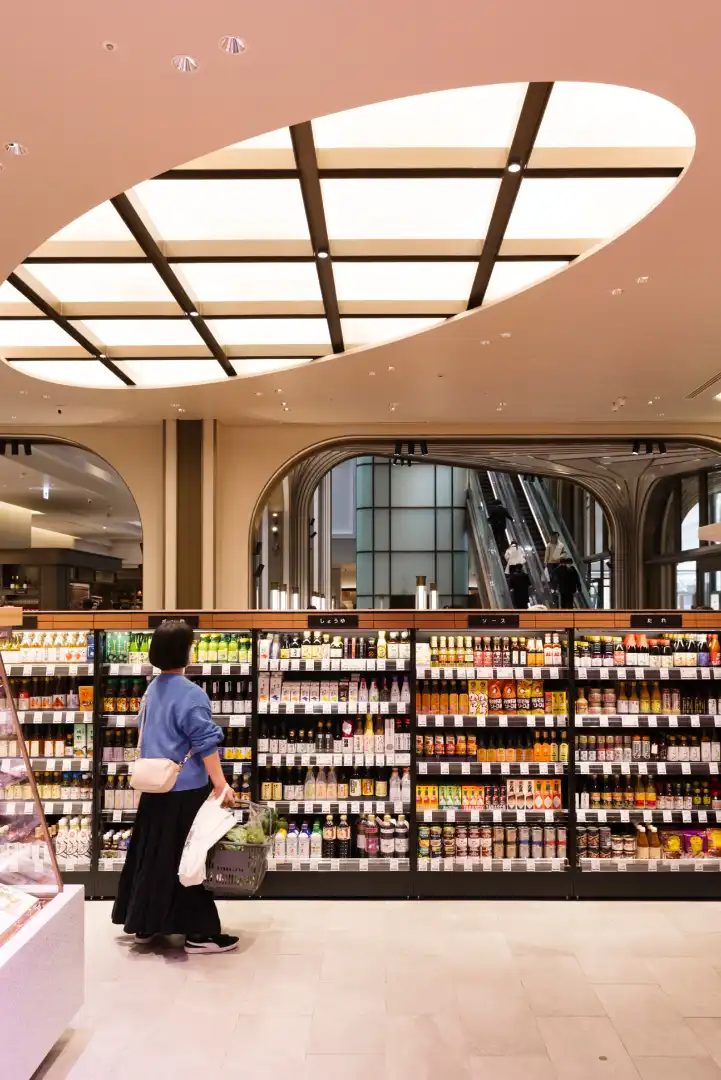 Wine is given its own space on an upper floor and run by Yamajin, a century-old wine merchant from Utsunomiya, led by Kenichi Ohashi, the only person in Japan to hold the Master of Wine title. It sells big French classics, amphora-aged wines from Georgia and a strong saké selection, and has a counter for trying the odd glass or two. For coffee lovers, emerge from the entrance (admiring the architecture by Thomas Heatherwick and architect Ai Yoshida of Japan’s Suppose Design) and pick up beans from Kyoto roasters Ogawa Coffee Laboratory. Dozens of varieties are lined up like fragrances and staff will blend according to taste.