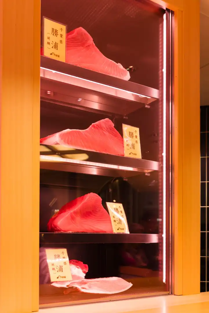 For fish, the team has netted top-drawer fishmongers Nezu Matsumoto and Yamayuki, which supplies many of the best restaurants in Tokyo. “I’ve been selling fish for 40 years but once I hit 60, I wanted to explore food education,” says Yukitaka Yamaguchi,  owner of Yamayuki. “It’s difficult to find an [marine] environment like Japan anywhere else. I want to show what’s out there. I don’t think farming is bad but I want people to know the natural taste of real, wild fish.” By working face to face with customers, Yamaguchi can also give advice. “We get to say, ‘It’s delicious if you eat it this way’”, he adds. One of the staff is skilfully cutting a 164kg tuna caught in Shimoda.