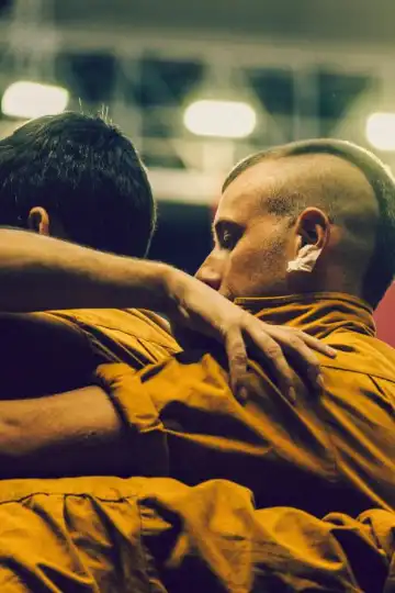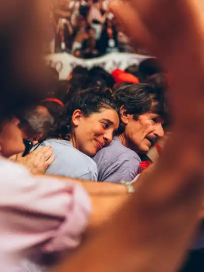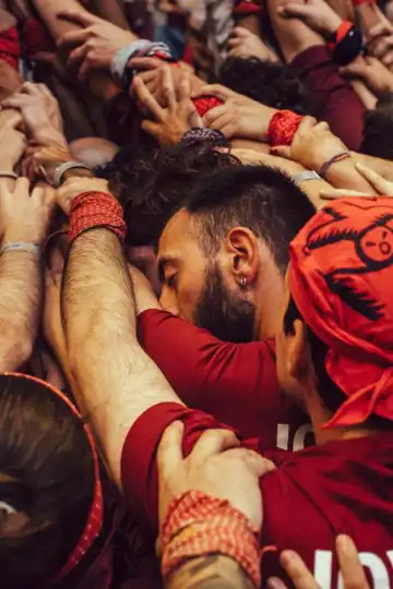 As competitors slowly pile into the centre of the Tarraco Arena Plaça, a former bullfighting ring that has heldcastellscompetitions since 1932, a voice on the loudspeakers introduces eachcolla, many of which have names that hint at the important role played by children: the Xiquets del Serrallo (Kids of El Serrallo); Marrecs de Salt (Brats from Salt); Nens del Vendrell (Children of El Vendrell). Children as young as five or six, whose job it is to climb up to the top of the tower, wear mouthguards and helmets. In pairs, participants help each other to wrap the all-important sash tightly around their waists. This crucial part of their outfit supports the lower back and provides grip for climbers on the ascent. A banner hanging on the edge of the arena reads, “Fent pinya, fas poble.” (“When you huddle together, you make a village.”)