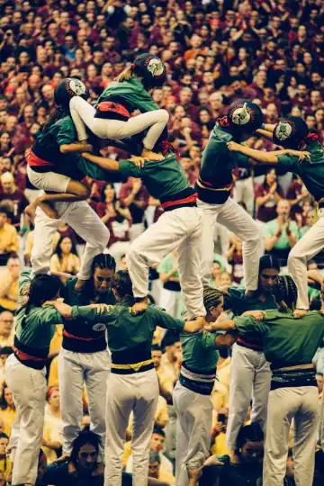 Over the past half-century thesecastells, once the result of a relatively marginal activity, have become one of the most potent symbols of Catalan identity. The tradition was declared a Masterpiece of the Oral and Intangible Heritage of Humanity by Unesco in 2010 and, since then, the number ofcolleshas doubled. The pastime originated in the 18th century in the town of Valls in the Tarragona region. Thecollesare thought to have developed from a popular dance tradition called Ball de Valencians; music remains central to the activity. Eachcollahas its own band that starts playing once the base of the tower – thepinya(pine cone) – has been built, and carries on as people climb up to form the upper tiers. The song “El Toc de Castells” guides participants to co-ordinate their movements with the melody, while those at the bottom are able to estimate the tower’s progression via the music.Castellscan be found at festivities across Catalonia, where the towers are often built in front of town halls and not necessarily competitive, though the activity is inherently ambitious.