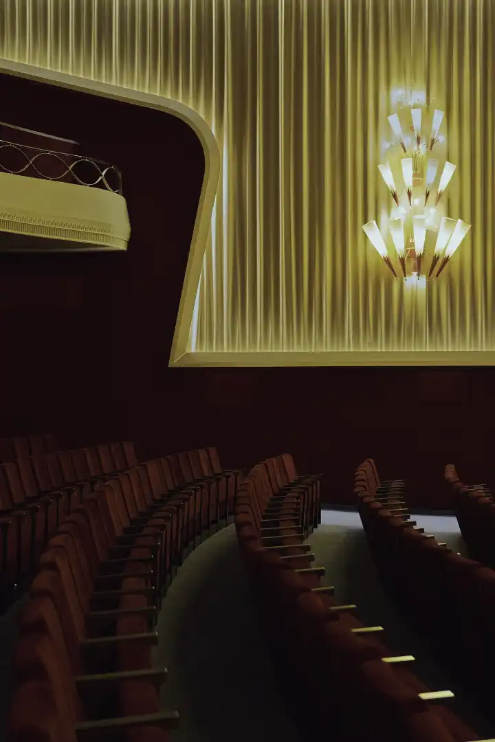 Fast-forward to the cinema’s third renovation, which began in 2021. Zahnd’s team restored the evocative art deco features with Schnegg in mind. Every intricate 1950s chandelier was painstakingly cleaned to eliminate ancient stains caused by cigarette smoke. When the panoramic screen was removed, Zahnd found a frayed sample of the original 1950s blue-grey carpet, allowing her to replicate its precise shade. The new corrugated-aluminium walls in the foyer imitate the folds of the velvet screen curtains that Pauchard installed in the grand auditorium.