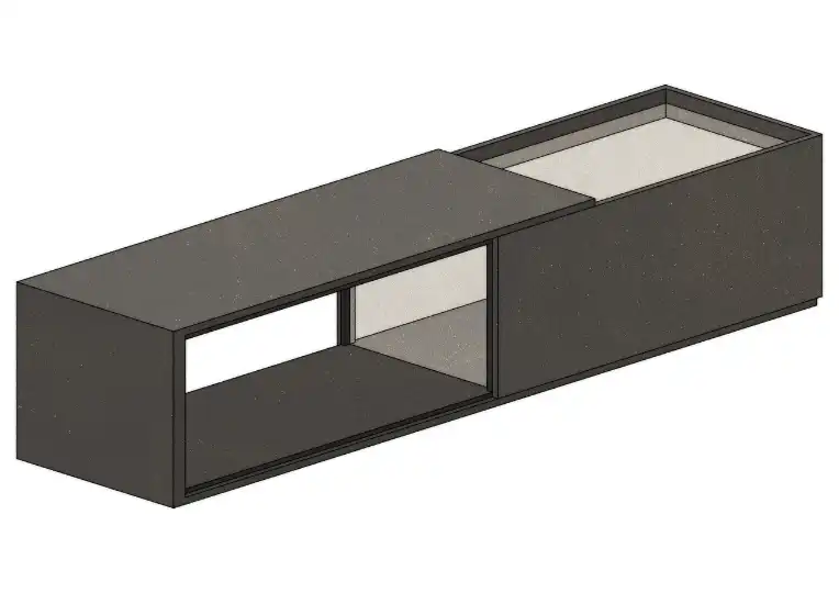 Dordoni Studio interprets constructivist geometry with this sideboard table, made from black-stained ash and mirrorpieces. The low, elongated structure connects two contrasting volumes: one side features a hollow form, while the other is topped with a mirror.