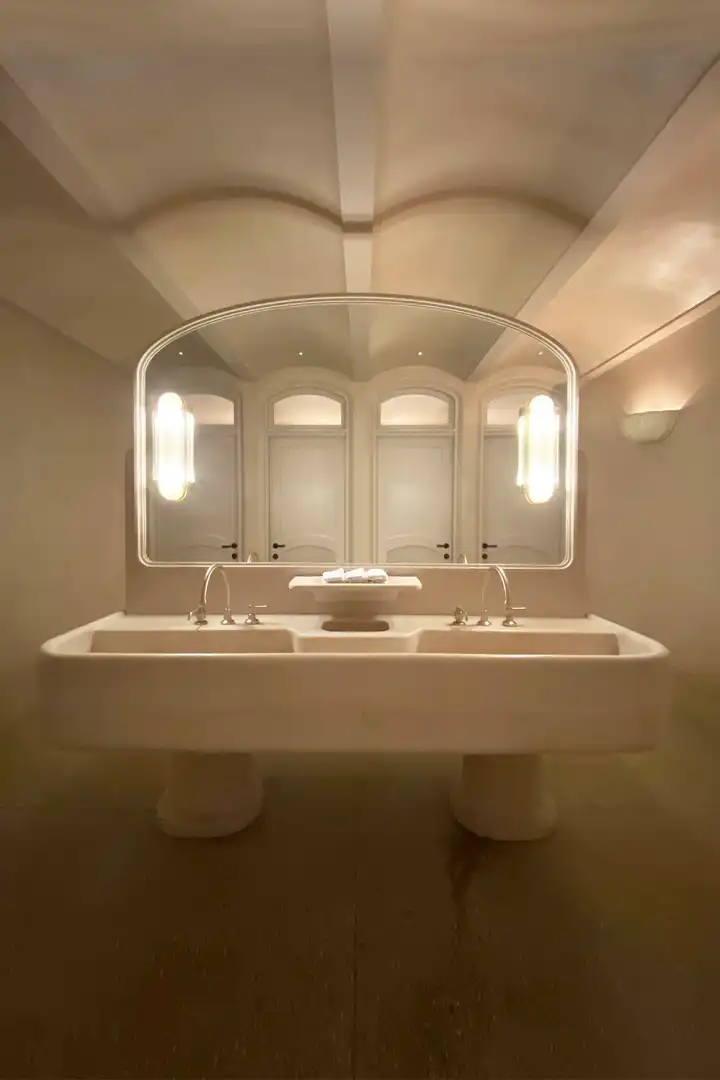Hand-painted marble arches, antique wall lights and custom trompe l’oeil carpets add to the mystique of this recently revived restaurant.