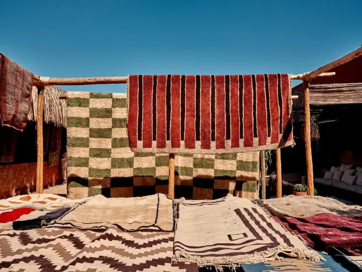 Beni Rugs’ HQ started with about 20 weavers, all of them women, and the number has since grown to 65. A new atelier opened in Sidi Zouine at the end of September, employing 20, and with the capacity to grow to more than double that number. Wright and Lobo-Navia are also eyeing another production facility, all part of creating centres of weaving talent. And while the brand still works with the initial partner for some orders to to a growth that more than tripled in the first few years of business, and currently stands at 40 per cent year-on-year, all rugs pass through Tameslouht for final checks, as well as the washing and surface burning that are part of the cleaning and softening process. After the rugs are hosed-down, they’re left out the back of the building and on the roof to bake dry in the North African sun.