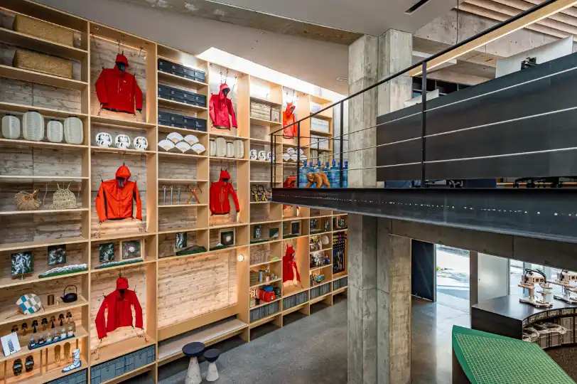 “We had this concept of creating a connection between inside and outside, the surrounding city and nature, as well as a place that is enriched by elements such as technology, culture and nature,” says Torafu architect Koichi Suzuno. The interior is filled with mountain-inspired artworks while one double-height wall is lined with Japanese craft and design, alongside vintage Arc’teryx jackets and mountain kit. “The wall is designed to provoke discussion and show the brand in context by displaying items from Japan with pieces that convey Arc’teryx’s history and philosophy,” says Suzuno.