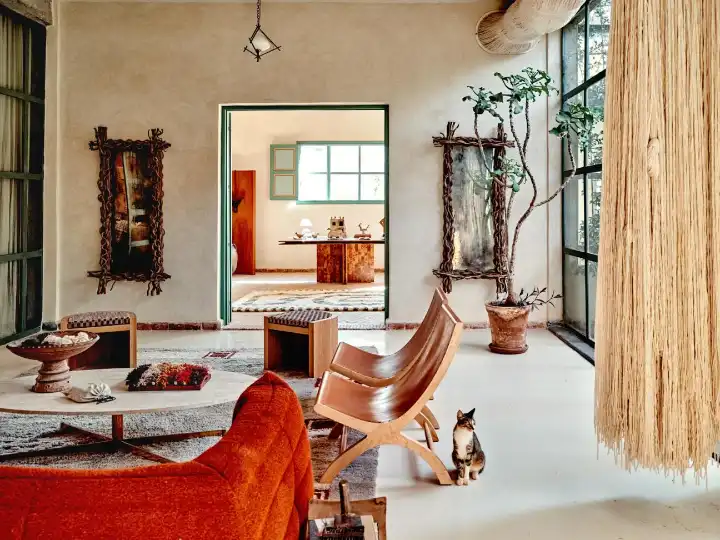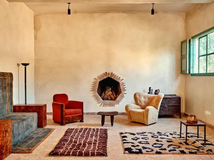 Walking past a garden full of olive trees, succulents and cacti, as well as apétanque court, you arrive at an impeccable showroom which feels influenced by Lobo-Navia’s years working in New York’s hospitality scene. There’s a red 1970s Togo sofa from Ligne Roset in front of a wood-and-marble bar with a La Marzocco coffee machine perched atop it. There are Clara Porset chairs from Luteca and a stunning locally made table in square pieces of Thuya wood; on its surface a collection of weaving books and antique trinkets. Next door’s office has a pair of mid-century sputnik chandeliers in Murano glass from a vintage dealer in Marrakech, while the walls are covered in Moroccan cork. Everywhere you look there are soft, colour-popping rugs underfoot, arranged with such taste that you want to step around rather than over them.