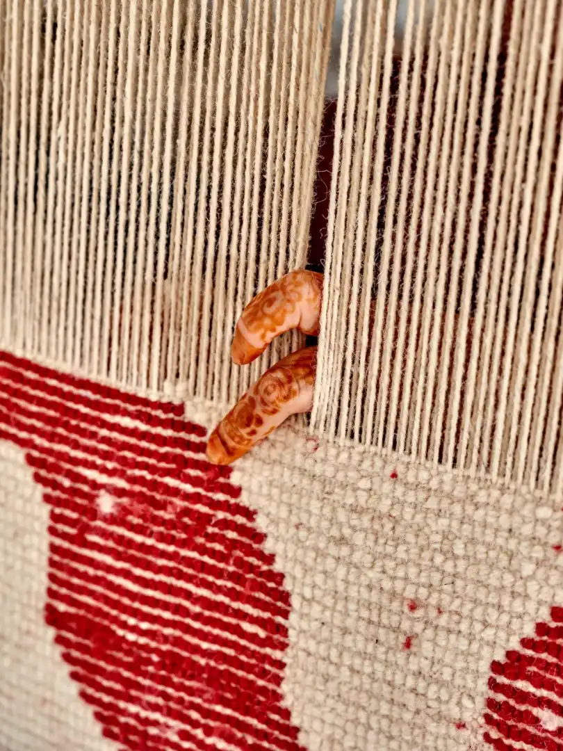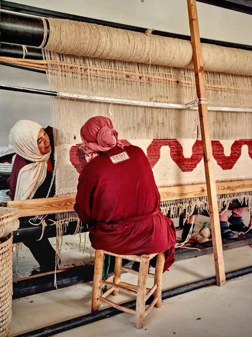 Weaving at a loom in the Beni Rugs HQ