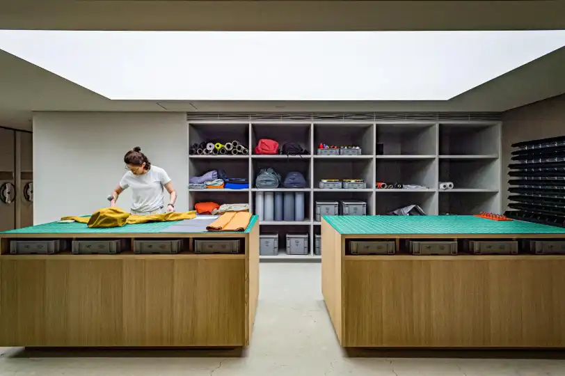 But unlike an ordinary creative workplace, the office has room for pattern makers and sewers to work on new ideas. Additionally, the basement, which doubles as an events space, contains a cutting room that’s equipped with materials and tools. Here, the Arc’teryx team can rapidly prototype and test ideas, speeding up the production process. “This is called a creation centre because we can actually make things here,” says Becker. “There are sewing machines and steam-tape machines. We can make a waterproof jacket in a day and go outside to test it right away.”
