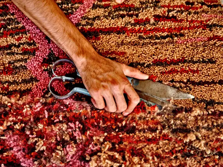 Both admit that bringing staff into the office wasn’t easy at the beginning due to cultural differences. But it has also proved a game changer. Traditionally, Moroccan weavers work at home or in small cooperatives near where they live, having to source their own yarn and find a market afterwards. At Beni, five buses a day bring people from Marrakech and villages to the office, and Beni’s founders have made sure that there is a real possibility for those coming onboard to work their way up from a beginner to amaallema (master). “In other facilities it’s hard to find young people,” says Afaf Chouhaidi, Beni’s director of operations. “But in the past few months we have had 10 young weavers join. There’s a career path.”