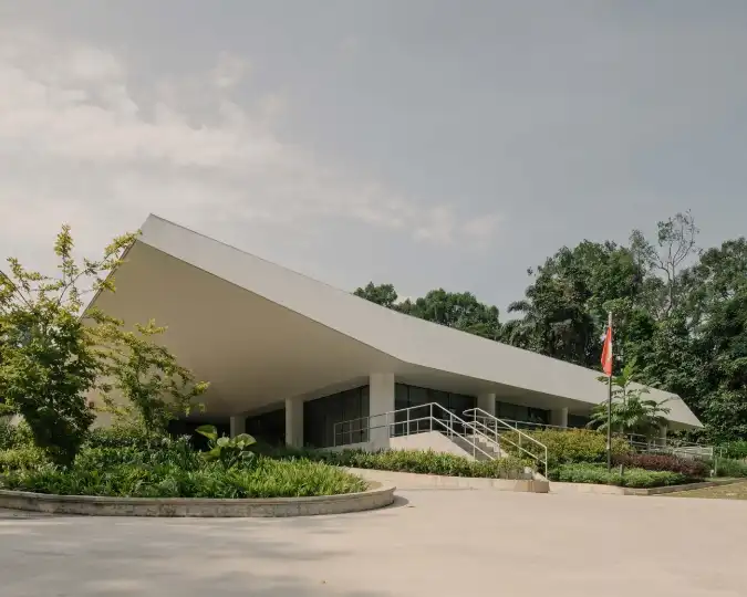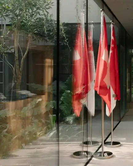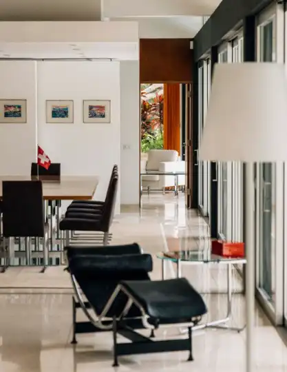 The building embodies a blend of values from Switzerland and Singapore. One challenge for the architects was how to fuse an authentically Swiss aesthetic with Singaporean architectural traditions and the local environment. They achieved it with a minimalist spin on the colonial black-and-white houses of Singapore and a careful integration of the surrounding tropical flora. Swissness is evoked in the clean lines and modernist furniture – and subtle nods to patriotism, such as the coat of arms in light relief on the walls outside.