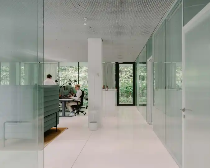 The total office space was expanded to accommodate 35 people, from a previous maximum of about 10. Solar panels were added to the new roof, helping the embassy to generate a substantial part of its energy in-house and powering the new EV charging stations in the garage. The renovation was completed at the end of 2023.