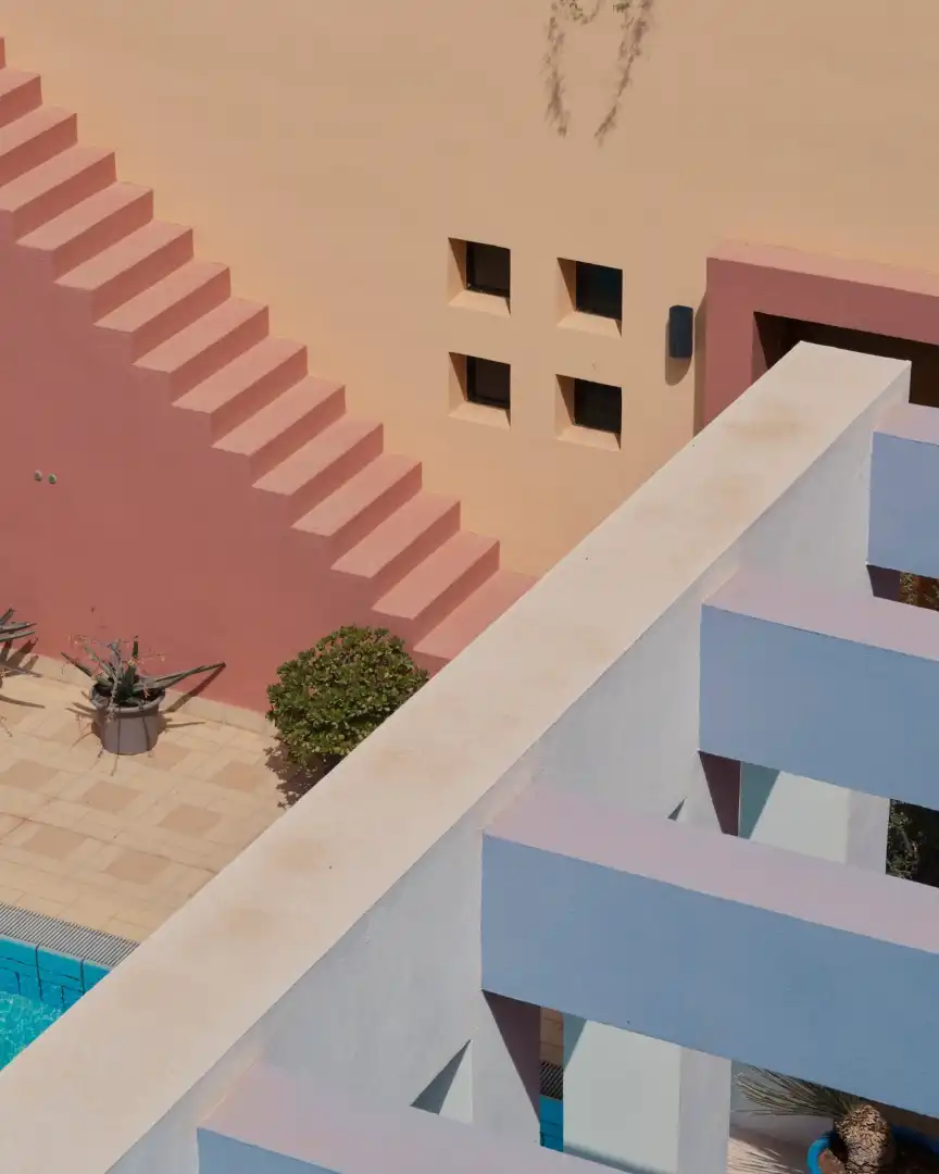 Freestanding walls and follies surround this hotel pool, creating a mirage-like effect.