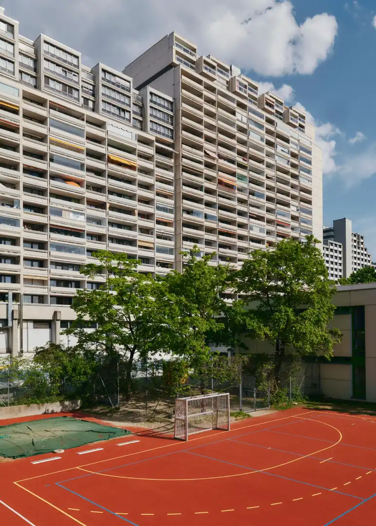 The task of turning this former dumping ground into lodgings for up to 16,000 Olympians, which could then become a legitimate neighbourhood post-Games, was entrusted to the firm Heinle, Wischer und Partner. Its scheme proposed terraced high-rise housing with cars and pedestrians on split levels – a concept, pioneered by Le Corbusier, that was the urban plan du jour in the late 1960s. From above, the site appears as three fingers of high-rises – so-calledTerrassenhäuser– that fork out from a central commercial area. Between the high-rises are scattered a variety of townhouse-type homes. South of the last row of terraced houses begins the former women’s village, which is now student housing, laid out in two opposite typologies: one thin, tall tower next to a spread of low, single-person bungalows.