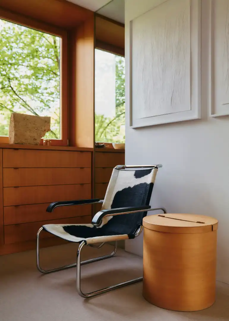 Lang has also joined the Olydorf architect cabal. In 2012 she and her husband bought a third-floor flat in a terraced house on Connollystrasse. The home is sunny in more ways than one: daylight streams in from a glass-walled terrace as wide as the apartment, and the colour yellow runs through the interiors down to the wall-to-wall moquette rug. A figurine of Waldi, the striped Dachshund mascot for the 1972 Games, and other Olympic paraphernalia take pride of place on the shelves. The bathroom is tiled in yellow and blue, the hues picked out from the original Olympic colour scheme, which is even matched by Knerer and Lang’s toothbrushes.